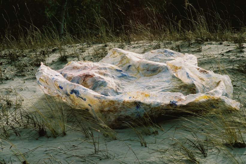 | Plastic Paintings: Hanlan's Point 10, Toronto Island, acrylic in plastic cling wrap sculpture, photograph of installation, 2007. Return to Installation Menu | Return to Hanlan's Point Installation Menu | Artist Statement |
