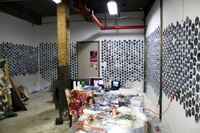 The images below are from Gareth Bate's studio. They show the current development of his Jewel Net of Indra installation which will take several years to complete. Gareth has now painted 1600 people, the original installation was 325. His ultimate goal is 6765. The finished version won't be exhibited for several years. Because the mirrors are now on opposite walls you can see the infinite reflection aspect that didn't happen in the original installation. See the first installation | Read Artist Statement and List of Names |