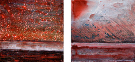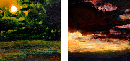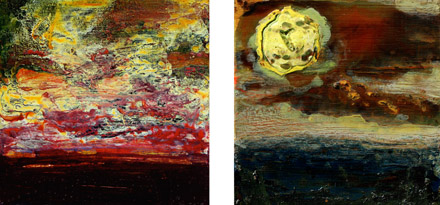 The Moments paintings depict vast open land beneath ominous stormy skies. These imagined landscapes have an intimate scale yet represent an epic space. Grouped together in sequences, they create a sense of shifting time and mood. The paintings depict the "spiritual" impact of the landscape, rather than its appearance. They embody human emotions and psychological states. Imagery emerges from flowing and pooling paint without reference to actual places.