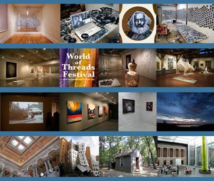 Smaller World of Threads ShowsI curated 5 smaller shows for the 2012 Festival. Four were co-curated with Dawne Rudman. Protrusion at Toronto's 401 Richmond St. W. featured four artists whose installations all protruded from the wall or from one floor to another. In Oakville the show Myth Making at The Display Area at Queen Elizabeth Park Community and Cultural Centre (QEPCCC) featured 3 artists dealing with mythology. Variegated Threads at QEPCCC was a variety of wall and installation work in the halls. The Outdoor Environmental Installations on the grounds of QEPCCC featured artists taking fibre outside. Fibre Collage at Abbozzo Gallery was a small show of collage work using fibre materials. Photo: Myth Making, Outdoor Environemental Installations and Protrusion. |