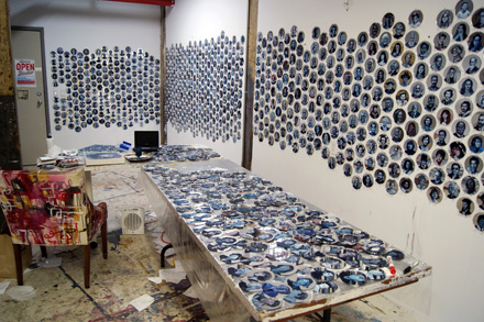 800 painted portraits for the Jewel Net of Indra installation.I have continued to expand my Jewel Net of Indra installation from the original 325 portraits to 800 as of Jan. 2013. It has developed into a major project that I'm committed to pursuing for the next four or five years. It has been the most engaging thing I've ever done. There are now finally enough portraits to place them on adjacent and opposite walls in order to achieve the infinite reflection or "many worlds" aspect of the piece which the original installation did not have. I've worked solidly on this piece, except for a six-month hiatus for curating the World of Threads. I was featured on "Studio Beat" a new website profiling artists in their studios. Read interview. |